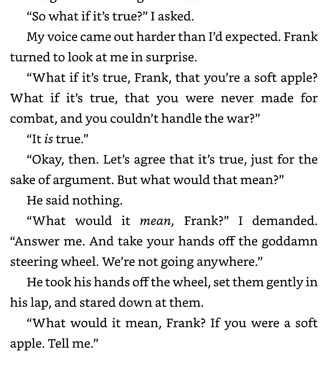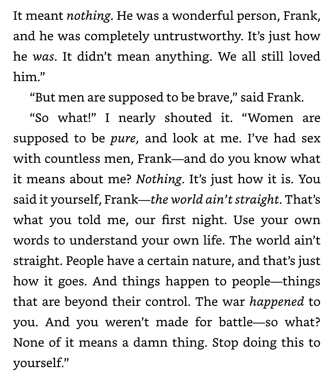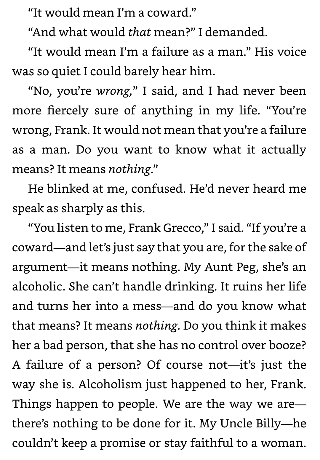 In the scene, the main character tells her friend he's not less of a person. Her friend is a World War 2 veteran, who is ashamed of his lack of bravery in the war.