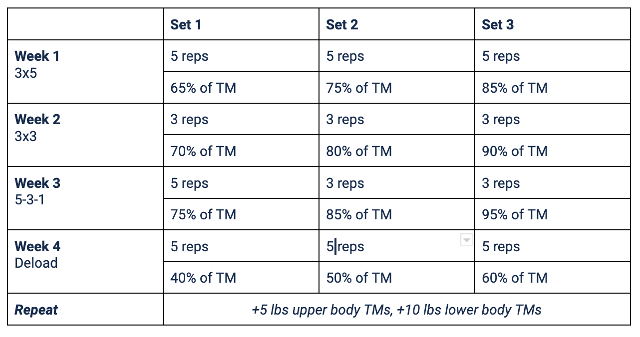 - To calculate your training max (TM): Start with a rep max for that exercise. For example, find the max weight you can squat for 5 reps. Use this 5 rep max (5RM) to calculate the 1 rep max (1RM). Say the 5RM is 135. The 1RM is the 5RM * 5 * 0.0333 + 5RM. So 135 * 5 * 0.0333 + 135. Take this 1RM and multiple by 0.9 to get your training max.