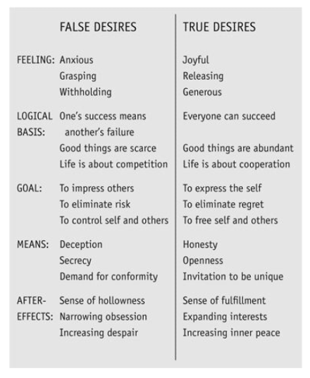 It takes focus, practice and sometimes experimentation to tell true desires from false ones, but if you continue to study your feelings, the process gets to be as easy as telling salt from sugar. Though they may look similar at first glance, true and false desires "taste" completely different. To put it briefly, false desires taste of fear; true desires always taste of love.